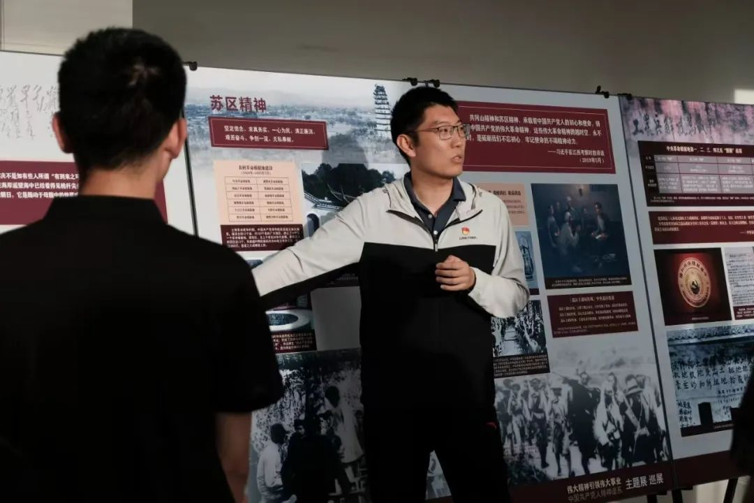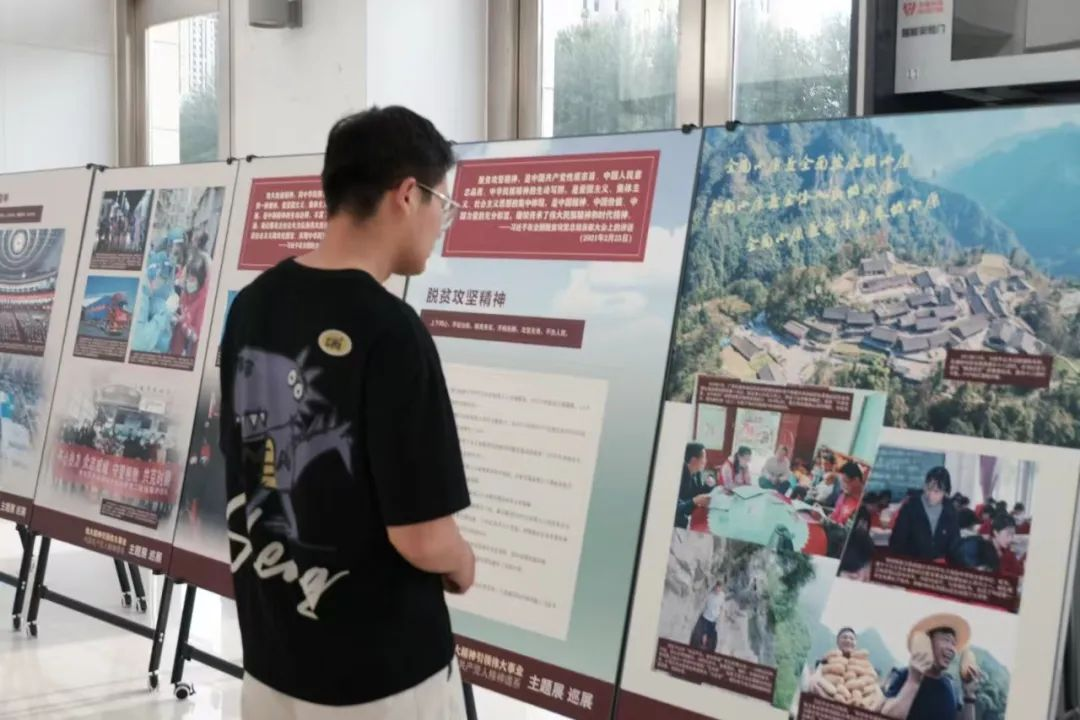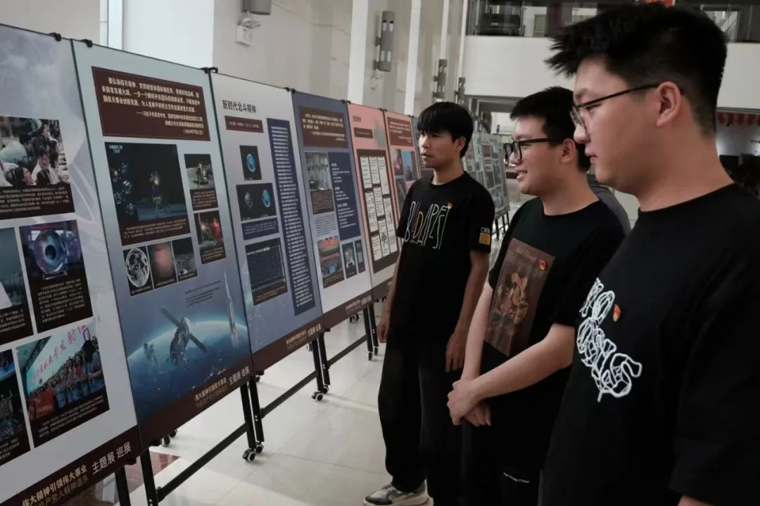 为进一步深化党史学习教育,传承红色基因,增强党员的历史使命感和责任感,中共太阳集团tyc5997(稀土工程技术学院)本科学生支部委员会于2025年6月4日晚6:30在逸夫楼一楼大厅开展党日活动,由院党委副书记冯佃臣书记及本科学生党支部书记韩聪一同志带领同学们参观以“伟大精神引领伟大事业——中国共产党人精神谱系”主题的巡展,并开展交流讨论,分享参观感悟与心得体会。