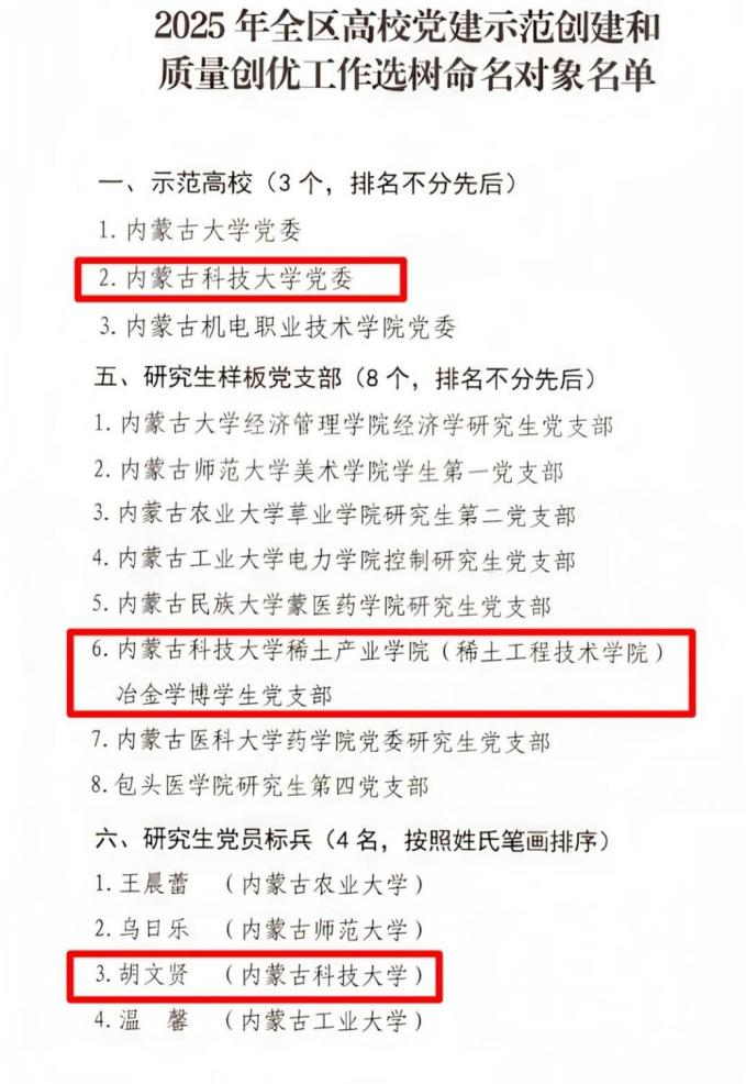 近日,自治区党委教育工委公示《2025年全区高校党建示范创建和质量创优工作选树命名对象名单》,tyc5997太阳集团党委成功入选全区高校党建“双创”示范高校。其中,太阳集团tyc5997(稀土工程技术学院) 作为学校服务国家战略、聚焦区域特色产业发展的重要平台,在党建与业务深度融合方面表现突出, 冶金学博学生党支部获评全区高校党建“双创”研究生样板党支部、冶金工程专业博士研究生胡文贤获评研究生党员标兵,成为我校此次“双创”工作中的最大亮点。